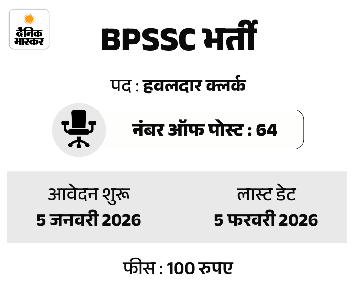 बिहार पुलिस सब-ऑर्डिनेट सर्विसेज कमीशन यानी BPSSC की ओर से पुलिस हवलदार क्लर्क के पदों पर भर्ती निकाली गई है। इस भर्ती के लिए आवेदन प्रक्रिया शुरू हो गई है। कैंडिडेट्स 2 फरवरी, 2026 तक BPSSC की ऑफिशियल वेबसाइट bpssc.bihar.gov.in पर जाकर इसमें अप्लाई कर सकते हैं।