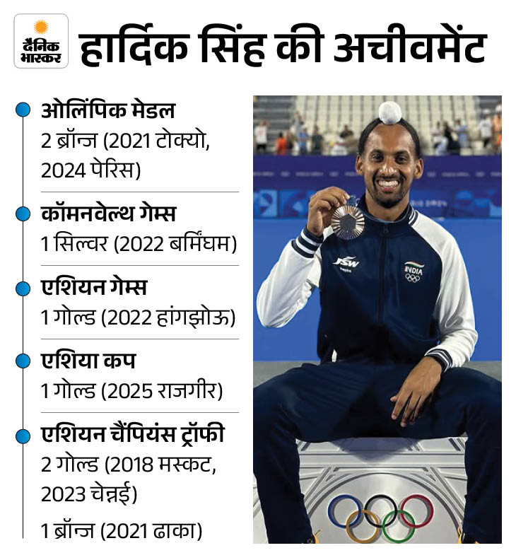 27 साल के हार्दिक सिंह टोक्यो 2021 और पेरिस ओलिंपिक 2024 में मेडल जीतने वाली भारतीय टीम का हिस्सा रहे हैं। उन्होंने इस साल आयोजित एशिया कप में गोल्ड मेडल जिताने में अहम भूमिका निभाई थी।
