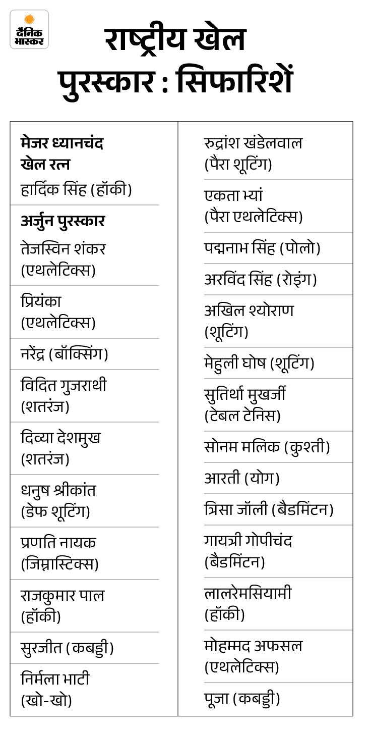 समिति ने शतरंज खिलाड़ी दिव्या देशमुख और डेकाथलॉन एथलीट तेजस्विन शंकर समेत 24 खिलाड़ियों को अर्जुन पुरस्कार के लिए चुना है।
