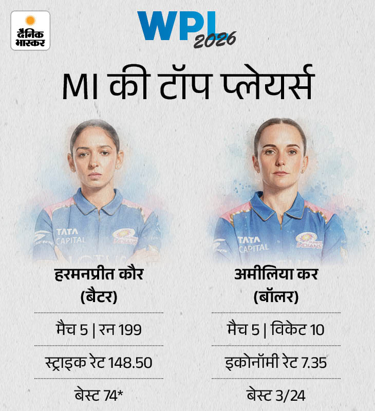 हरमनप्रीत कौर टॉप बैटर मुंबई की कप्तान हरमनप्रीत कौर इस सीजन टीम की सबसे सफल बल्लेबाज हैं। उन्होंने 5 मैचों में 199 रन बनाए हैं, जिसमें नाबाद 74 रन उनका बेस्ट स्कोर है। अमेलिया कर मुंबई और इस सीजन दोनों की टॉप बॉलर हैं। उन्होंने 5 मैचों में 10 विकेट लिए हैं, जिसमें 24 रन देकर 3 विकेट उनका बेस्ट प्रदर्शन रहा। पिछले मैच में यूपी के खिलाफ भी अमेलिया ने सबसे ज्यादा 3 विकेट झटके थे, हालांकि उस मुकाबले में मुंबई को हार का सामना करना पड़ा।