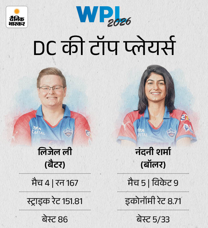वहीं दिल्ली कैपिटल्स की ओर से विकेटकीपर और ओपनर लिजेल ली ने सबसे ज्यादा रन बनाए हैं। उन्होंने अब तक 167 रन बनाए हैं, जिसमें 86 रन उनका बेस्ट स्कोर है।