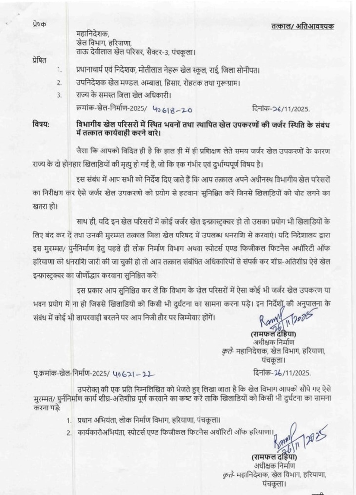 उधर, हरियाणा खेल विभाग ने राज्यभर के सभी खेल परिसरों में लगे जर्जर स्पोर्ट्स इक्विपमेंट को तुरंत हटाने के निर्देश जारी कर दिए हैं।