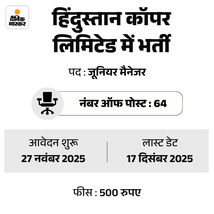 हिंदुस्तान कॉपर लिमिटेड (HCL) में 60 से ज्यादा पदों पर भर्ती निकली है। उम्मीदवार एचसीएल की ऑफिशियल वेबसाइट hindustancopper.com पर जाकर अप्लाई कर सकते हैं। सरकारी या सार्वजनिक उपक्रमों में कार्यरत उम्मीदवारों को एनओसी देना जरूरी है।