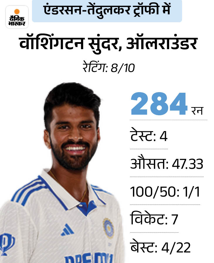 9. Washington Sundar: 8/10 All -rounder Sundar got a chance in 4 Tests, out of which he also scored 284 runs along with taking 7 wickets. Sundar batting at number-8 position every time, but played useful innings. He also scored a century with Jadeja while drawing a Manchester test. Sundar had also brought the team to around 400 by putting a fifty in the fifth Test.
