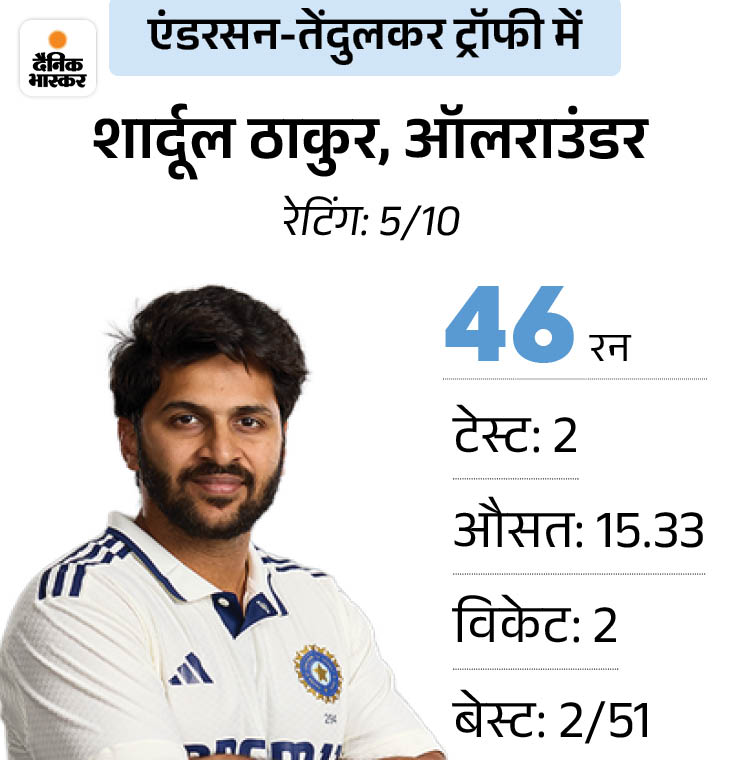 11. Shardul Thakur: 5/10 All -rounder Shardul Thakur also played only 2 Tests in the series. In these, he took 2 wickets with 46 runs. He got batting in 3 innings. In the first 2 innings, he could only score 5 runs, but in 1 innings of Manchester Test, he helped India to take 41 runs to a big score.