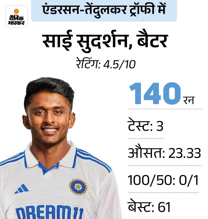 4. Sai Sudarshan: 4.5/10 Sudarshan got to play 3 Tests in the series. Where he scored 31, 38 and 61 runs in 3 innings. Could not even open an account in 2. He scored 11 runs in an innings. Sudarshan also got a good start in 3 innings, but they could not turn it into a big score.