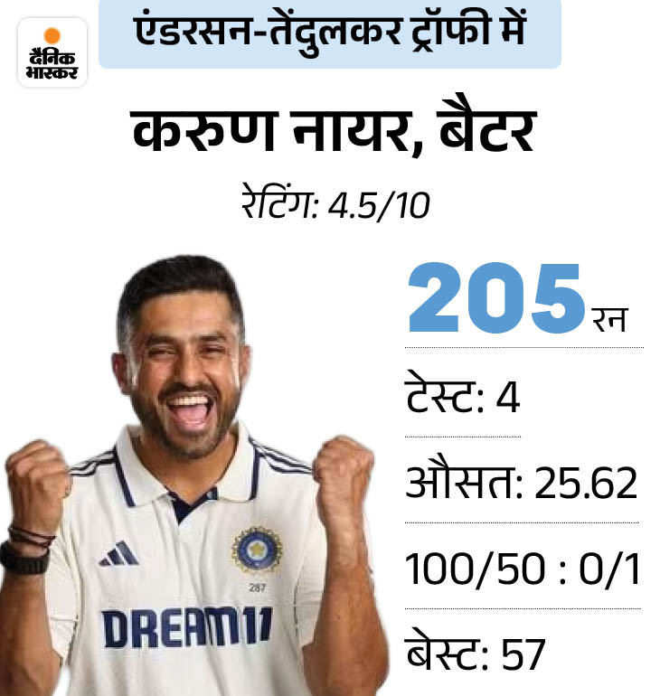 3. Karun Nair: 4.5/10 Karun Nair, who was playing Test after 8 years, got a chance in 4 Tests. He started on several occasions, but could not score a big score. Even his only fifty came in the last match of the series. However, this half -century came into very difficult pitch and condition. Due to which his numbers increased.
