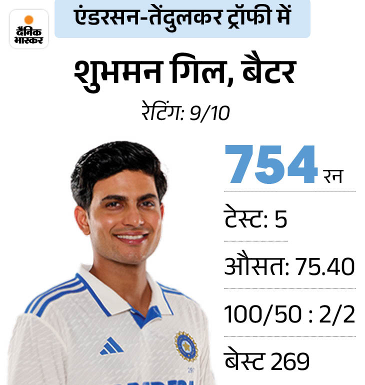 5. Shubman Gill: 9/10 Captain Shubman Gill scored the highest 754 runs in 10 innings of the series. Among them, he had 4 centuries in his name. Shubman also gave the team the only victory by hitting a century in both innings of the second Test. However, he could not even cross the 25 -run mark during any innings at both London stadiums.