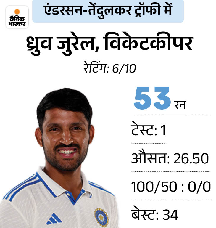 7. Dhruv Jurael: 6/10 Wicketkeeper Batter Dhruv Jurael could play the same Test. After Pant was engaged in the fifth match, he got a chance, in which he played 34 and 19 runs on a difficult pitch. Jurael did batting in 1 match, but wicketkeeping’s duty was played in 3 Tests, in which he was excellent.