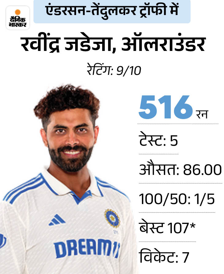 8. Ravindra Jadeja: 9/10 In English condition, spinners do not get much help, yet all -rounder Ravindra Jadeja did not spend much runs from his bowling. He also took 7 wickets in 5 Tests. Although Jadeja proved more than his importance in the series, he was the third top scorer of the team by scoring 516 runs.