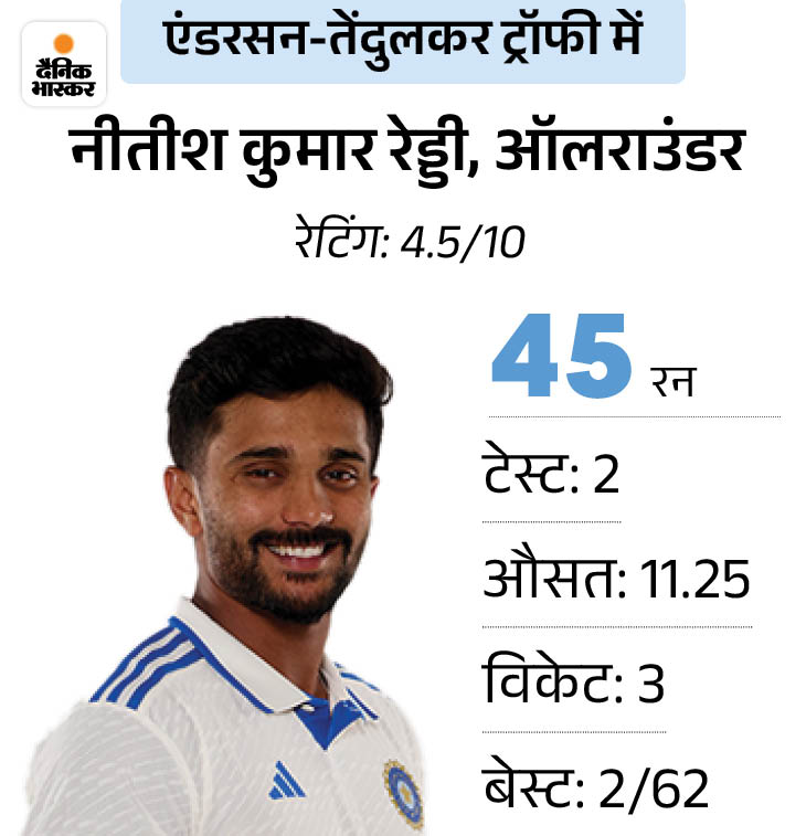 10. Nitish Kumar Reddy: 4.5/10 All -rounder Nitish Kumar Reddy was included in the team to strengthen the batting, but could only score 45 runs in 4 innings of 2 Tests. Among them, one of his innings was 30 runs. He definitely took 3 wickets in bowling. All three wickets came in Lord’s Test. After this match, he became engrossed during practice. Reddy could not impress so much with his batting, so it is difficult to get a chance in the next series.