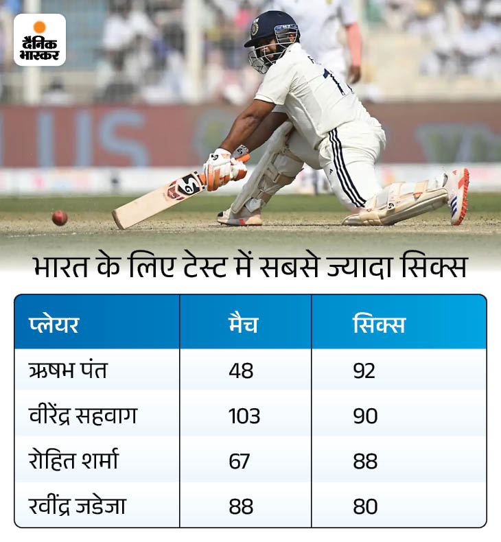 9. पंत टेस्ट में भारत के लिए सबसे ज्यादा सिक्स लगाने वाले बैटर ऋषभ पंत भारत के लिए टेस्ट में सबसे ज्यादा सिक्स लगाने वाले बल्लेबाज बन गए। पंत के 48 मैच में अब 92 सिक्स हो गए हैं। उन्होंने वीरेंद्र सहवाग के रिकॉर्ड को तोड़ा। सहवाग ने 103 मैच में 90 सिक्स लगाए थे।