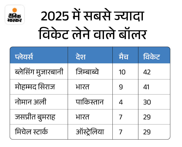 6. सिराज 2025 में हाईएस्ट विकेट टेकर बनने से मात्र एक विकेट दूर मोहम्मद सिराज इस साल टॉप विकेट लेने से मात्र एक विकेट दूर हैं। उन्होंने कोलकाता टेस्ट में कुल 4 विकेट चटकाए। सिराज के नाम अब 9 मैच में 41 विकेट हो गए हैं। टॉप पर जिम्बाब्वे के तेज गेंदबाज ब्लेसिंग मुजरबानी हैं। उनके नाम 10 टेस्ट में 42 विकेट हैं।