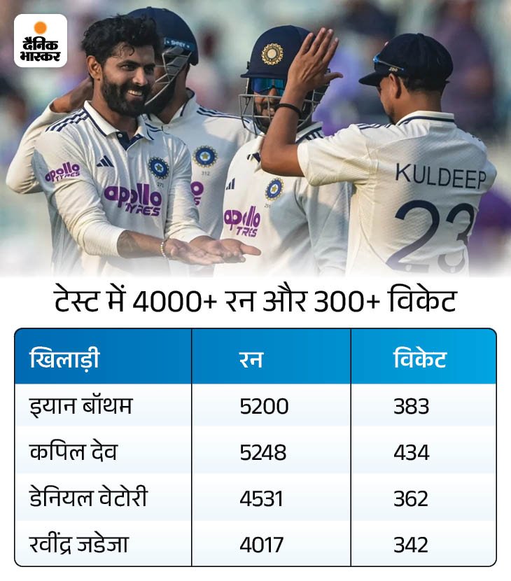 10. जडेजा 4000 रन और 300 विकेट लेने वाले दूसरे भारतीय ऑलराउंडर रवींद्र जडेजा टेस्ट में 4000 रन और 300 विकेट लेने वाले दूसरे भारतीय बने। उनसे पहले कपिल देव यह कारनामा कर चुके हैं। ओवरऑल टेस्ट क्रिकेट में जडेजा चौथे प्लेयर बने। पहले नंबर पर इंग्लैंड के इयान बॉथम हैं। उन्होंने 5200 रन बनाने के साथ 383 विकेट लिए हैं। जडेजा ने भारत में अपने 250 विकेट भी पूरे किए।