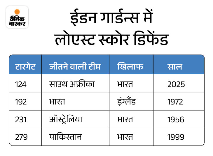 4. साउथ अफ्रीका ने ईडन गार्डन्स में लोएस्ट स्कोर डिफेंड किया साउथ अफ्रीका ने कोलकाता के ईडन गार्डन्स स्टेडियम का सबसे कम टोटल डिफेंड कर लिया। टीम ने 124 रन के टारगेट का पीछा कर रही भारतीय टीम को 93 रन पर समेट दिया। इससे पहले 1972 में भारत ने इंग्लैंड के खिलाफ 192 रन बचाए थे।