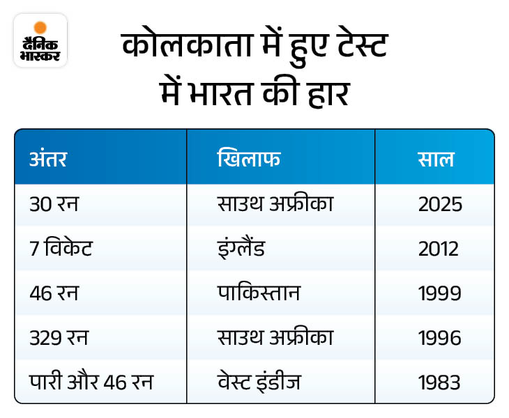 3. ईडन गार्डन्स में 13 साल बाद हारा भारत ईडन गार्डन्स में 13 साल बाद भारत को किसी टेस्ट में हार मिली। टीम को आखिरी बार इंग्लैंड ने 2012 में 7 विकेट से हराया था।