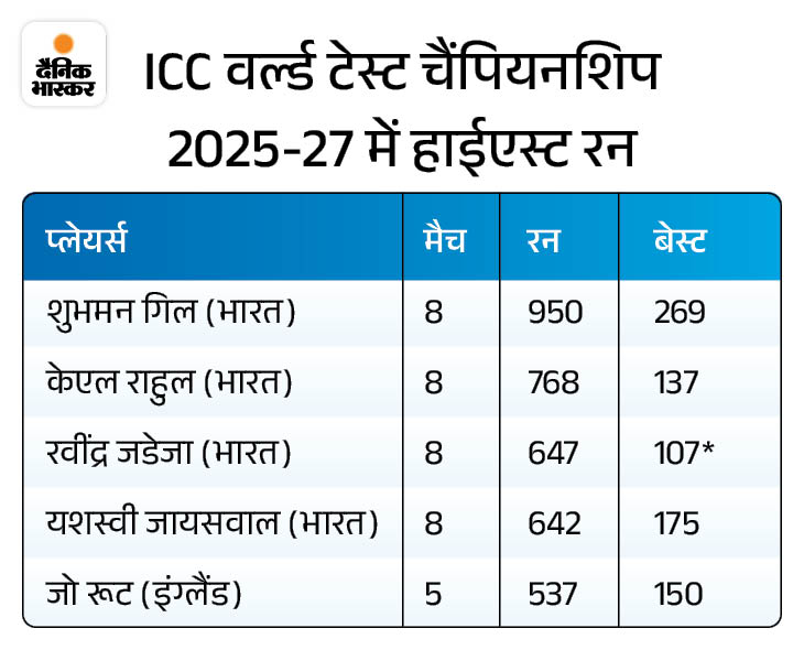 7. वर्ल्ड टेस्ट चैंपियनशिप 2025-27 में टॉप-4 भारतीय बैटर्स वर्ल्ड टेस्ट चैंपियनशिप 2025-27 के टॉप-5 रन स्कोरर में 4 बल्लेबाज भारत के हैं। इस लिस्ट में सबसे ज्यादा रन कप्तान शुभमन गिल के नाम हैं। उन्होंने 8 मैच में 950 रन बनाए हैं। दूसरे नंबर पर 768 रन के साथ केएल राहुल बने हुए हैं।