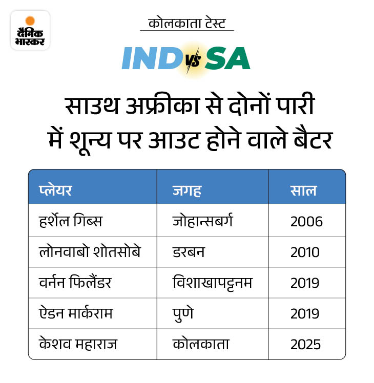 8. केशव महाराज दोनों पारी में शून्य पर आउट टेस्ट में भारत के खिलाफ भारत में साउथ अफ्रीका से दोनों पारी में शून्य होने वाले बैटर में केशव महाराज का नाम जुड़ गया है। कोलकाता में केशव खाता तक नहीं खोल सके। हर्शेल गिब्स 2006 में दोनों पारी में शून्य के स्कोर पर आउट हुए थे।