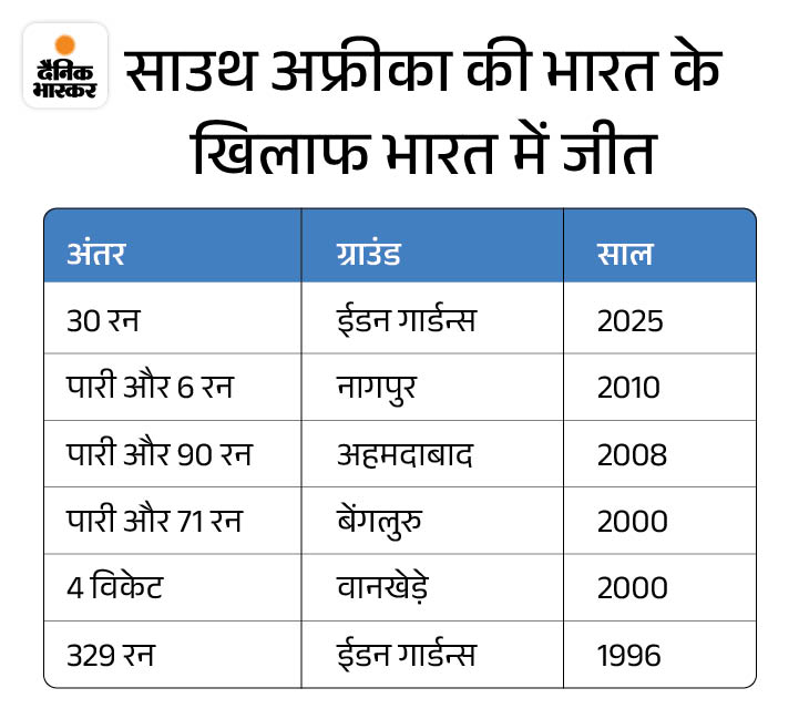 रविवार को भारत 13 साल बाद कोलकाता के ईडन गार्डन्स में कोई टेस्ट हार गया। टीम साउथ अफ्रीका के दिए हुए 124 रन के टारगेट को चेज नहीं कर सकी। ऐसा पहली बार हुआ जब भारत अपने घर पर 125 रन या उससे कम का लक्ष्य हासिल नहीं कर सकी।