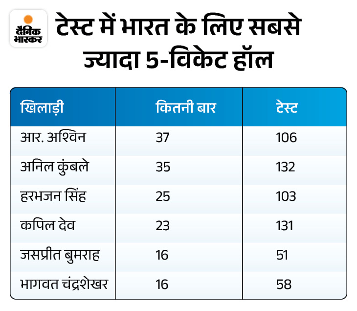 12. बुमराह ने टेस्ट क्रिकेट में 16वीं बार 5 विकेट लिए जसप्रीत बुमराह ने टेस्ट क्रिकेट में 16वीं बार 5-विकेट हॉल लिया। उन्होंने यह कारनामा 51वें टेस्ट में किया। भारत के लिए सबसे ज्यादा 5-विकेट हॉल रविचंद्रन अश्विन ने नाम हैं। उन्होंने 106 टेस्ट में 37 बार 5 विकेट लिए हैं।