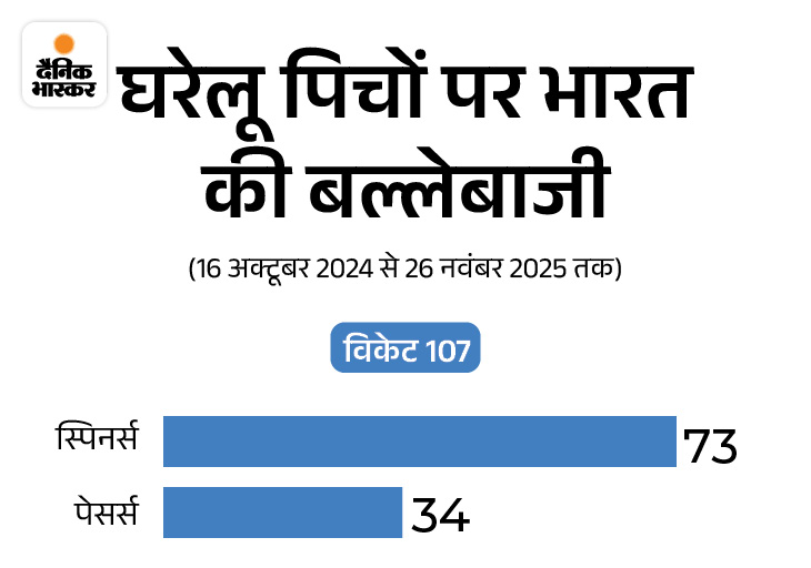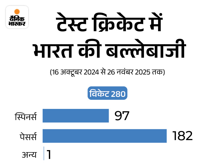 पिछले एक साल के आंकड़े भी तस्वीर और साफ कर देते हैं। 16 अक्टूबर 2024 से अब तक टीम इंडिया ने घरेलू मैचों में कुल 280 विकेट गंवाए हैं। इनमें से 182 पेसर्स को और 97 स्पिनर्स को मिले हैं। सिर्फ घरेलू पिचों पर गिरने वाले 107 विकेटों में पेसर्स के खिलाफ 34 और स्पिनर्स के खिलाफ 73 बल्लेबाज आउट हुए हैं।