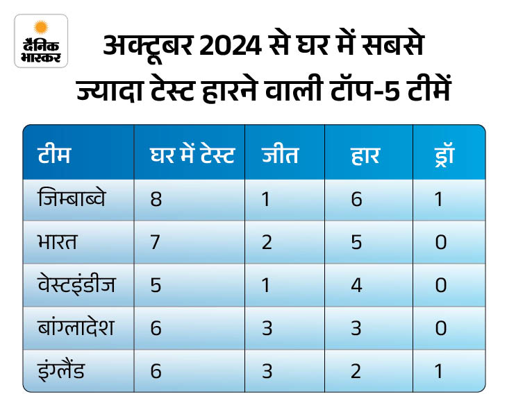 सिर्फ वेस्टइंडीज को हरा सके अक्टूबर 2024 से अब तक भारतीय टीम घरेलू मैदानों पर तीन सीरीज खेली है। न्यूजीलैंड ने 3-0 से और साउथ अफ्रीका ने 2-0 से हराया। इन दोनों सीरीज के बीच भारत ने वेस्टइंडीज के खिलाफ दो मैच जीते। यानी 7 में से 5 घरेलू टेस्ट में भारत को हार झेलनी पड़ी।