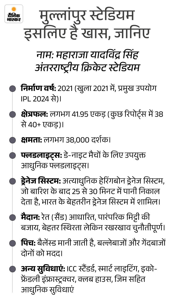 2. आधुनिक इंफ्रास्ट्रक्चर और सुविधाएं: मुल्लांपुर स्टेडियम भारत के नए क्रिकेट वेन्यू में से एक है, जिसमें अच्छा ड्रेनेज सिस्टम, अच्छी पिच कंडीशन और इंटरनेशनल स्टैंडर्ड सुविधाएं हैं। यह पहले से ICC और BCCI से इंटरनेशनल मैचों के लिए अप्रूव्ड है, इसलिए टेस्ट के लिए सुरक्षित और उपयुक्त माना गया।