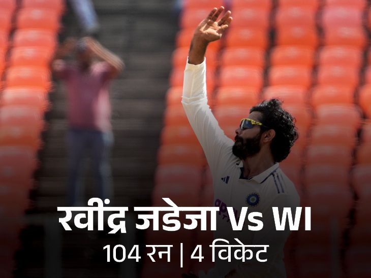 जडेजा बैट और बॉल दोनों से छाए, कपिल के क्लब में एंट्री के करीब ऑलराउंडर रवींद्र जडेजा इस मैच में बल्लेबाजी और गेंदबाजी दोनों से वेस्टइंडीज पर भारी पड़े। उन्होंने भारत की पहली पारी में नाबाद 104 रन बनाए। यह उनके टेस्ट करियर की छठी सेंचुरी है। इसके बाद उन्होंने वेस्टइंडीज की दूसरी पारी में 4 विकेट भी झटके।