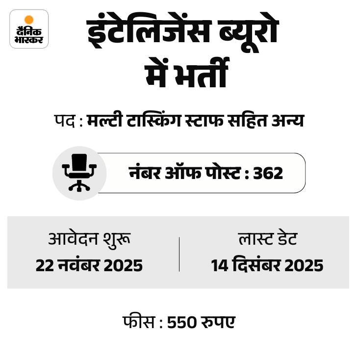 गृह मंत्रालय के अंतर्गत इंटेलिजेंस ब्यूरो (IB) ने मल्टी टास्किंग स्टाफ की भर्ती निकाली है। उम्मीदवार ऑफिशियल वेबसाइट mha.gov.in या ncs.gov.in पर जाकर अप्लाई कर सकते हैं। उम्मीदवार जिस राज्य के लिए आवेदन कर रहे हैं, इससे संबंधित डोमिसाइल सर्टिफिकेट भी होना चाहिए।