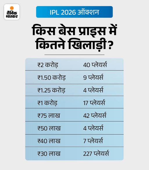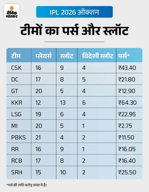 IPL के 19वें सीजन का मिनी ऑक्शन आज दोपहर 2:30 बजे से अबू धाबी में शुरू होगा। 10 टीमों के पास 237.55 करोड़ रुपए का पर्स है। वहीं, लखनऊ सुपर जायंट्स (LSG) के पास ₹22.95 करोड़ का पर्स है। नीलामी में 350 प्लेयर्स उतरेंगे, लेकिन 77 ही बिक पाएंगे। इसमें लख