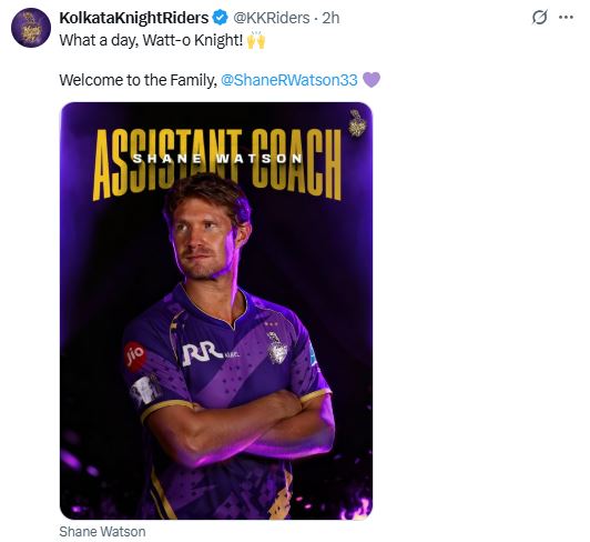 वॉटसन ने कहा, मैं कोलकाता को एक और खिताब दिलाने के लिए कोचिंग स्टाफ और खिलाड़ियों के साथ मिलकर काम करने के लिए उत्सुक हूं।
