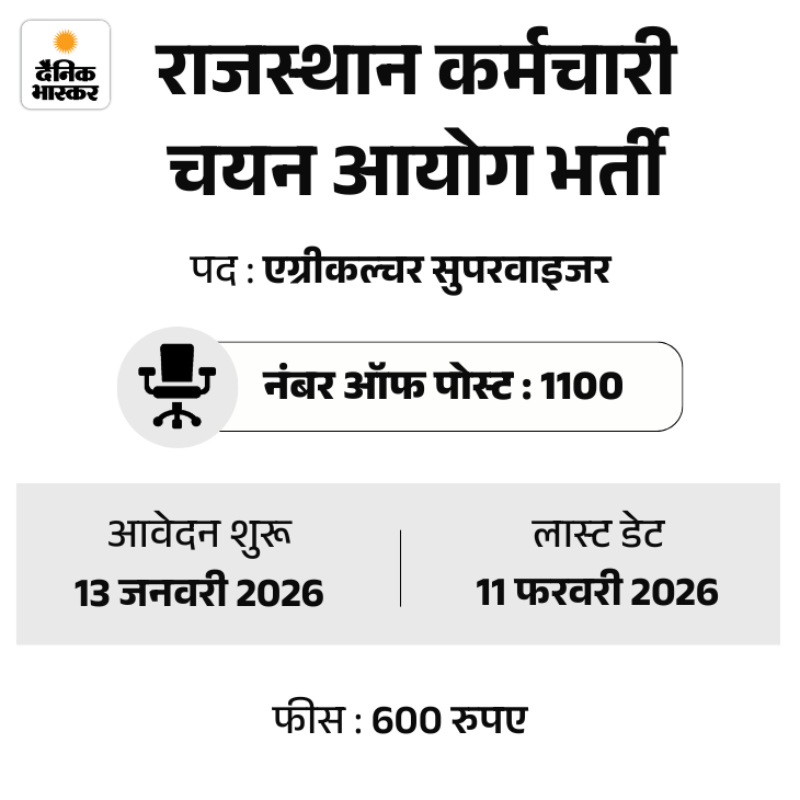 राजस्थान कर्मचारी चयन आयोग यानी RSSB की ओर से एग्रीकल्चर सुपरवाइजर के 1,100 पदों पर भर्ती निकाली गई है। इस वैकेंसी के लिए ऑनलाइन आवेदन प्रक्रिया 13 जनवरी, 2026 से शुरू होगी और 11 फरवरी, 2026 तक इसके लिए अप्लाई कर सकते हैं।
