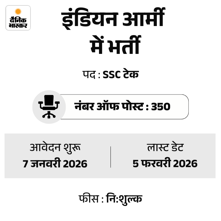 इंडियन आर्मी ने शॉर्ट सर्विस कमीशन (टेक्निकल) भर्ती 2026 का नोटिफिकेशन जारी कर दिया है। इसके तहत कुल 350 पदों पर भर्ती होने हैं। इन पदों के लिए आवेदन की प्रक्रिया शुरू हो गई है।