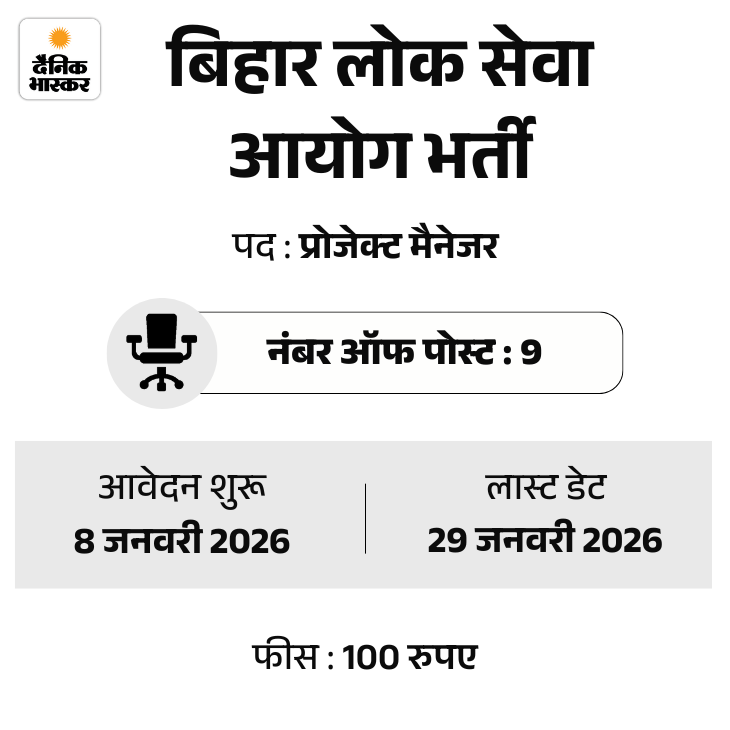बिहार लोक सेवा आयोग यानी BPSC ने प्रोजेक्ट मैनेजर भर्ती के लिए नोटिफिकेशन अपनी ऑफिशियल वेबसाइट पर जारी कर दिया है। यह भर्ती 9 पदों के लिए है। इसके लिए आवेदन की प्रक्रिया आज यानी 8 जनवरी, 2026 से शुरू हो गई है।