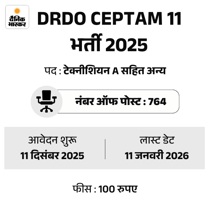 रक्षा अनुसंधान एवं विकास संगठन (DRDO) की ओर से CEPTAM 11 भर्ती के लिए आवेदन की आखिरी तारीख 1 जनवरी 2026 थी जिसे 11 जनवरी तक के लिए एक्सटेंड किया गया है। उम्मीदवार ऑफिशियल वेबसाइट drdo.gov.in पर जाकर आवेदन कर सकते हैं।