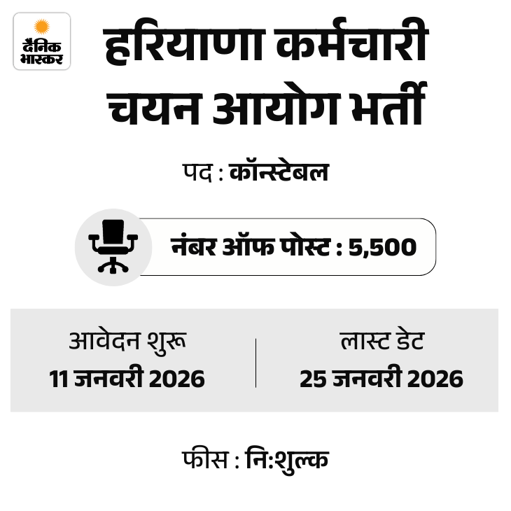 हरियाणा कर्मचारी चयन आयोग ने हरियाणा पुलिस में कॉन्स्टेबल के 5,500 पदों पर भर्ती का नोटिफिकेशन जारी किया है। उम्मीदवार 11 जनवरी 2026 से ऑफिशियल वेबसाइट hssc.gov.in पर जाकर ऑनलाइन आवेदन कर सकते हैं। इसे अब तक की सबसे बड़ी भर्ती माना जा रहा है।