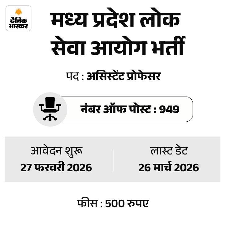 मध्य प्रदेश लोक सेवा आयोग (MPPSC) ने 31 दिसंबर 2025 को असिस्टेंट प्रोफेसर वैकेंसी 2026 का नोटिफिकेशन जारी किया गया था। इस भर्ती के लिए ऑनलाइन आवेदन 27 फरवरी 2026 से शुरू किए जाएंगे। उम्मीदवार ऑफिशियल वेबसाइट mponIine.gov.in पर जाकर ऑनलाइन रजिस्ट्रेशन कर सकेंगे।