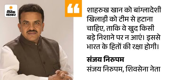1. निरुपम बोले- शाहरुख अपनी टीम से रहमान को बाहर करें शिवसेना नेता संजय निरुपम ने KKR के मालिक शाहरुख खान से बांग्लादेशी क्रिकेटर मुश्तफिजुर रहमान को टीम से हटाने की अपील की है। निरुपम ने कहा- ‘जब पूरा देश बांग्लादेश को लेकर गुस्से और नाराजगी में है। हम उनसे अनुरोध करते हैं कि वे उस बांग्लादेशी खिलाड़ी को टीम से हटा दें।’ वहीं, शिवसेना (यूबीटी) के प्रवक्ता आनंद दुबे ने कहा- बांग्लादेशी खिलाड़ियों को IPL में भारतीय धरती पर खेलने की अनुमति नहीं दी जानी चाहिए।