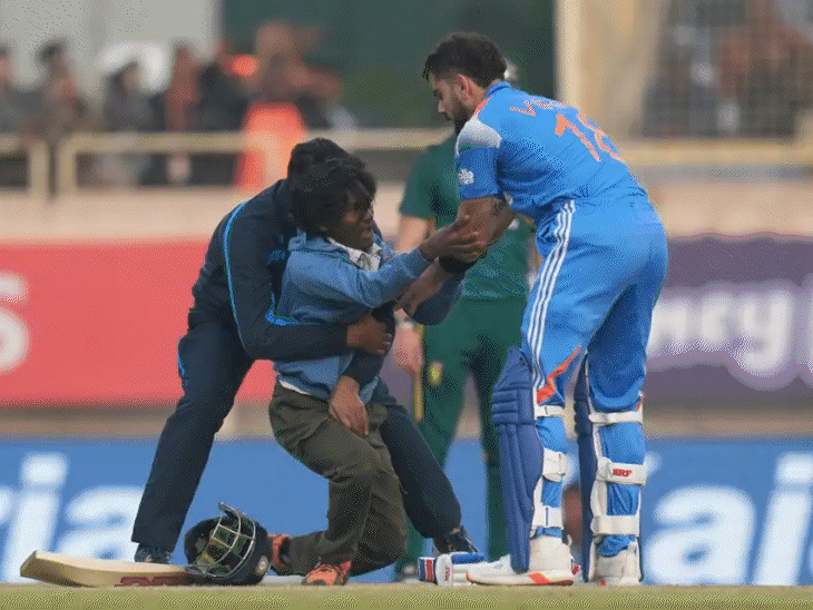 विराट कोहली के शतक के बाद एक फैन सिक्योरिटी तोड़कर मैदान में घुस आया और बाद में उनके पैर भी छू लिए। - Dainik Bhaskar