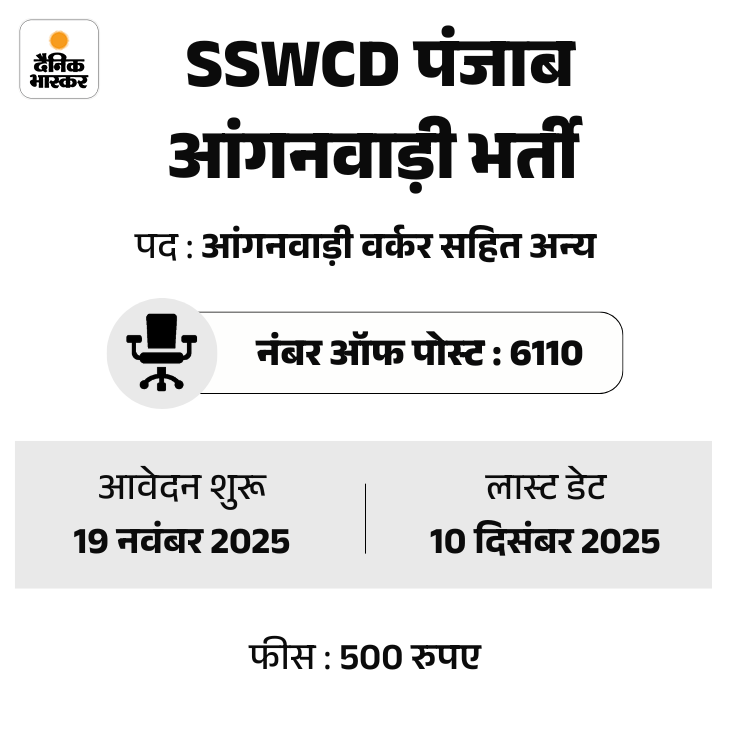 पंजाब आंगनवाड़ी में वर्कर और हेल्पर के 6000 से ज्यादा पदों पर भर्ती निकली है। इस भर्ती के लिए आवेदन की आज यानी 10 दिसंबर, 2025 को आखिरी तारीख है।