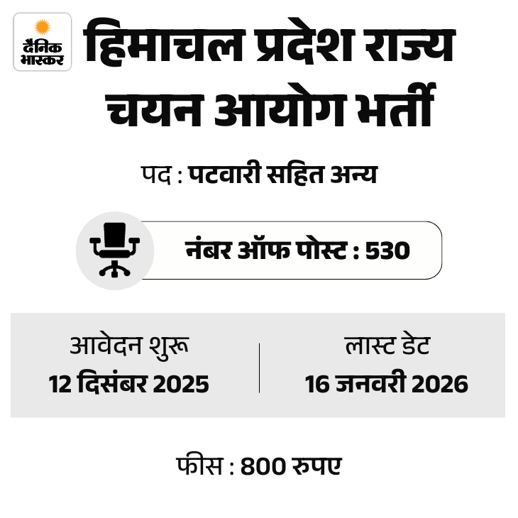 हिमाचल प्रदेश राज्य चयन आयोग (HPRCA) की ओर से पटवारी के 530 पदों पर भर्ती का नोटिफिकेशन जारी किया गया है। इस भर्ती के लिए ऑनलाइन आवेदन प्रक्रिया 12 दिसंबर से शुरू होगी। फॉर्म में करेक्शन के लिए फीस के अलावा 100 रुपए अलग से देने होंगे।
