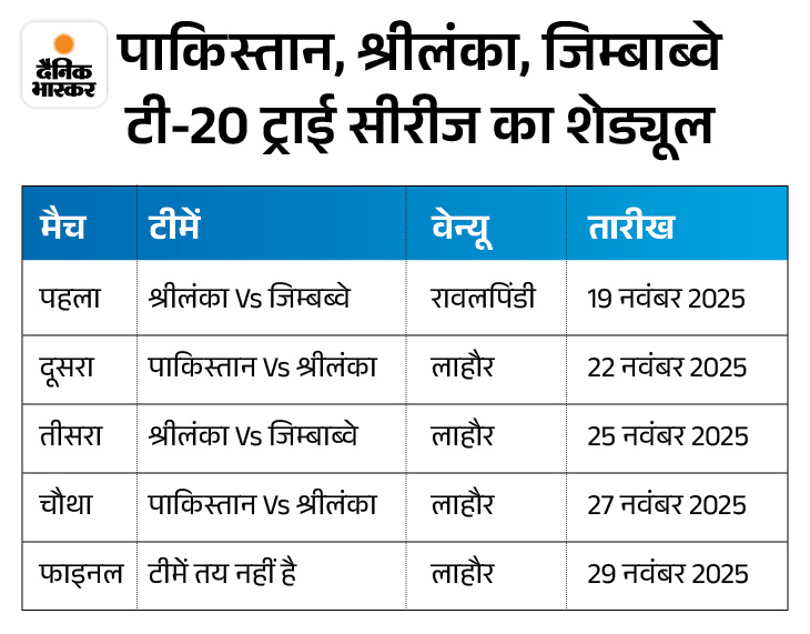ट्राई सीरीज की शुरुआत 19 नवंबर से, जिम्बाब्वे भी खेलेगा श्रीलंकाई टीम पाकिस्तान में वनडे सीरीज के बाद ट्राई सीरीज भी खेलेगी। इसमें जिम्बाब्वे की टीम भी लेंगी। ट्राई सीरीज का पहला मैच 19 नवंबर को खेला जाएगा।