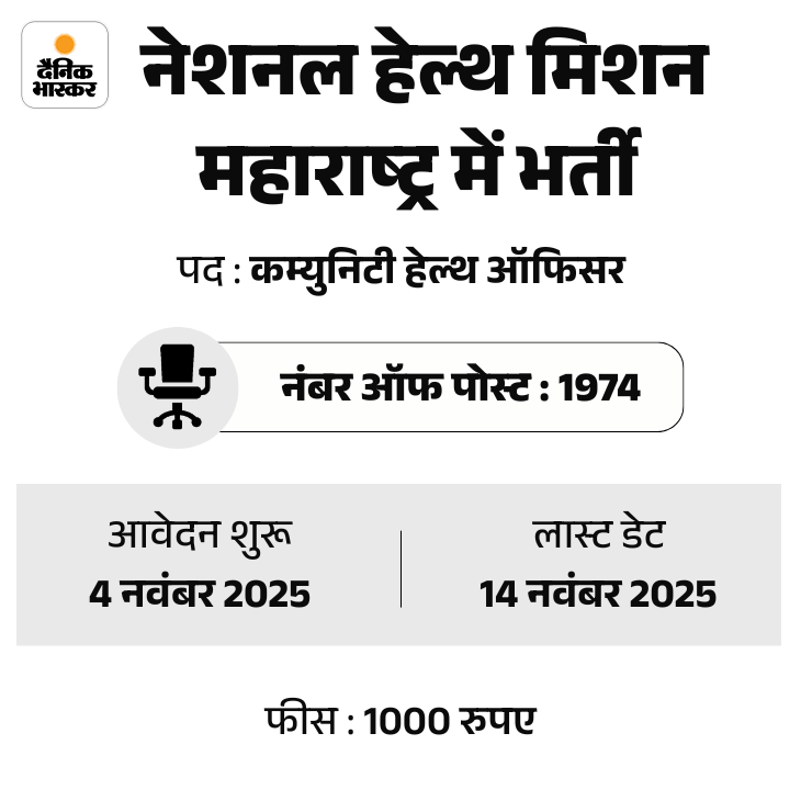 नेशनल हेल्थ मिशन, महाराष्ट्र में कम्युनिटी हेल्थ ऑफिसर के 1974 पदों पर वैकेंसी निकली है। उम्मीदवार nhm.maharashtra.gov.in पर जाकर अप्लाई कर सकते हैं।