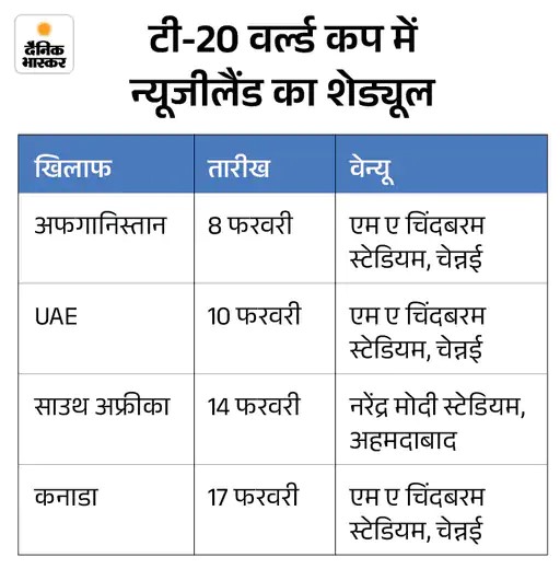न्यूजीलैंड का पहला मैच 8 फरवरी को टी-20 वर्ल्ड कप 7 फरवरी से भारत और श्रीलंका में खेला जाना है। टूर्नामेंट भारत और श्रीलंका में 7 शहरों के 8 वेन्यू पर खेला जाएगा। 29 दिन में 55 मैच होंगे। न्यूजीलैंड का पहला मैच 8 फरवरी को अफगानिस्तान के खिलाफ खेला जाएगा।