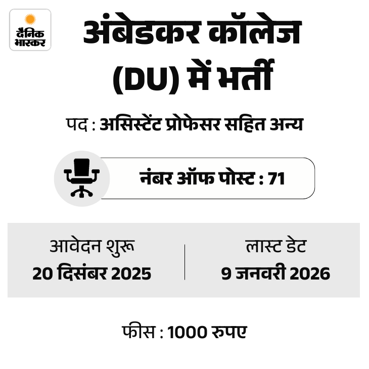 दिल्ली विश्वविद्यालय के अंबेडकर कॉलेज में प्रोफेसर सहित 71 पदों पर भर्ती निकली है। उम्मीदवार कॉलेज की ऑफिशियल वेबसाइट audrec.samarth.edu.in पर जाकर अप्लाई कर सकते हैं। एप्लिकेशन की हार्डकॉपी सबमिशन की आखिरी तारीख 16 जनवरी 2026 तय की गई है।