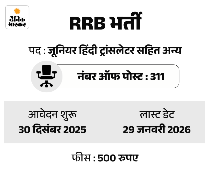 रेलवे भर्ती बोर्ड ने 311 पदों पर भर्ती का नोटिफिकेशन जारी किया है। इस भर्ती के लिए आवेदन की शुरुआत 30 दिसंबर 2025 से होगी। उम्मीदवार ऑफिशियल वेबसाइट rrbapply.gov.in पर जाकर आवेदन कर सकेंगे।