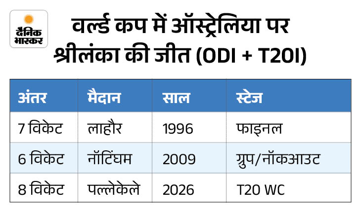 श्रीलंका ने वर्ल्ड कप (टी-20+वनडे) में केवल तीसरी बार ऑस्ट्रेलिया को हराया। 1996 वनडे वर्ल्ड कप फाइनल में 7 विकेट की ऐतिहासिक जीत से लेकर 2009 में नॉटिंघम और अब 2026 में पल्लेकेले में 8 विकेट से जीत तक, श्रीलंका ने बड़े मौकों पर ऑस्ट्रेलिया को चौंकाया है।