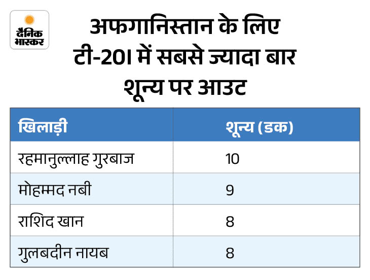 रहमानुल्लाह गुरबाज अफगानिस्तान के लिए टी-20 में सबसे ज्यादा बार शून्य पर आउट होने वाले बल्लेबाज बन गए हैं। वे 10वीं बार बिना खाता खोले पवेलियन लौटे। मोहम्मद नबी (9) दूसरे स्थान पर हैं, जबकि राशिद खान और गुलबदीन नईब 8-8 बार शून्य पर आउट हुए हैं।