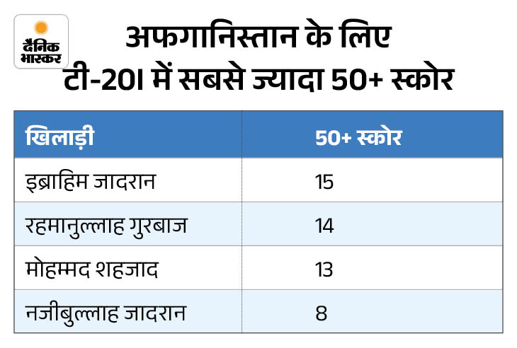 इब्राहिम जादरान अफगानिस्तान के लिए टी-20 इंटरनेशनल में सबसे ज्यादा 50+ स्कोर बनाने वाले बल्लेबाज बन गए हैं। उन्होंने 15 बार पचास या उससे ज्यादा रन की पारियां खेली हैं। गुरबाज (14) और मोहम्मद शहजाद (13) इस सूची में उनके पीछे हैं।