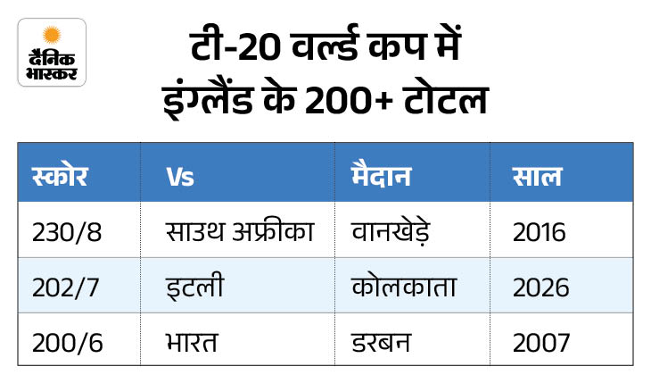 2026 टी-20 वर्ल्ड कप में रिकॉर्ड छठी बार 200+ स्कोर बना, जो इस टूर्नामेंट के एक एडिशन में सबसे ज्यादा है। इससे पहले 2007 में 5 बार और 2016 व 2024 में 4-4 बार 200+ टोटल बने थे।
